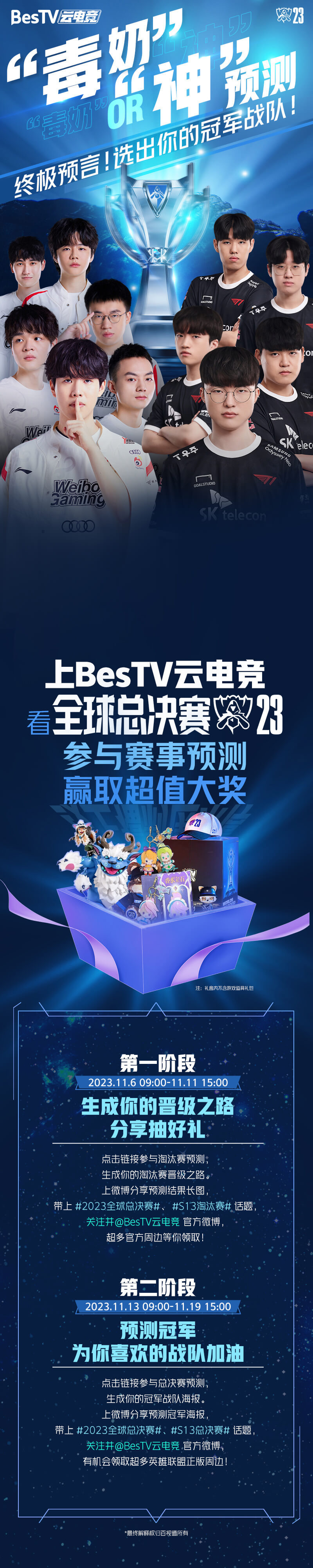 赛事预测:用户对英雄联盟S13全球总决赛赛事进行输赢、对局预测,每场比赛预测截止时间为比赛开始前1小时。分享预测结果至微博,带上#2023全球总决赛#